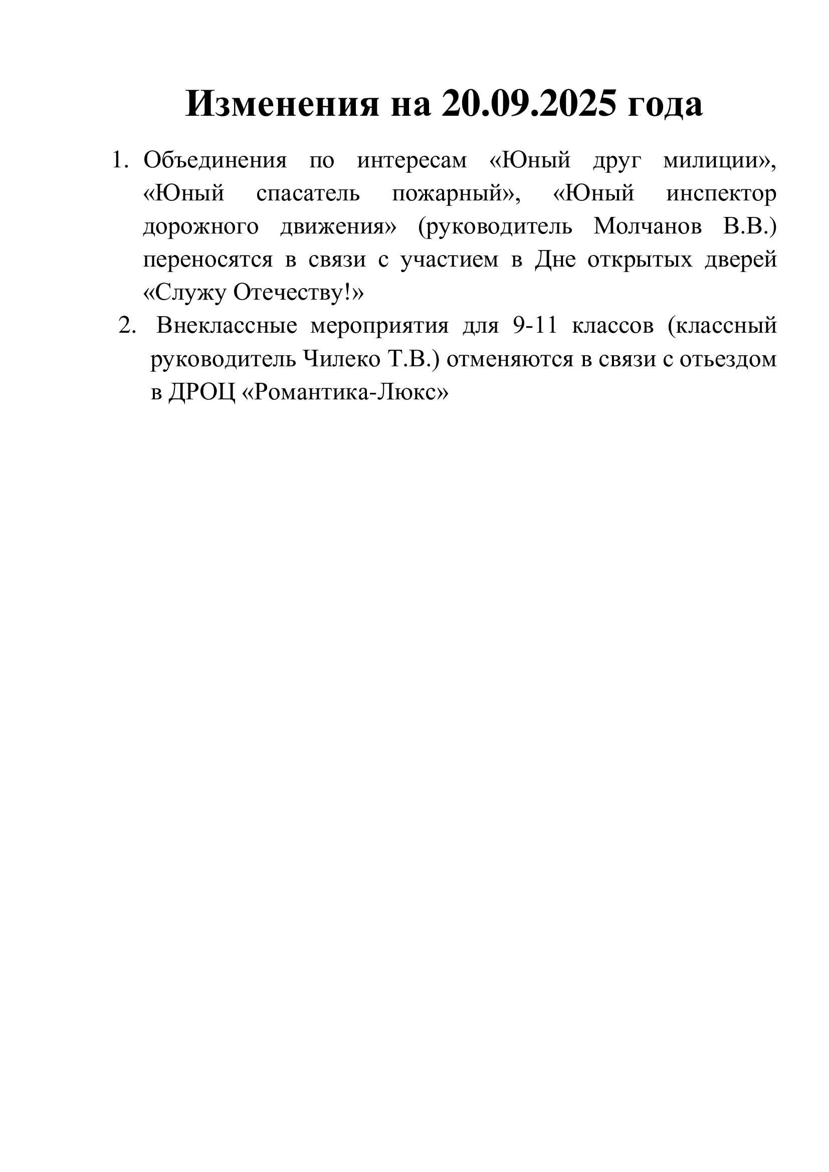 Изменения в план работы в 6-ой школьный день на 20.12.2025