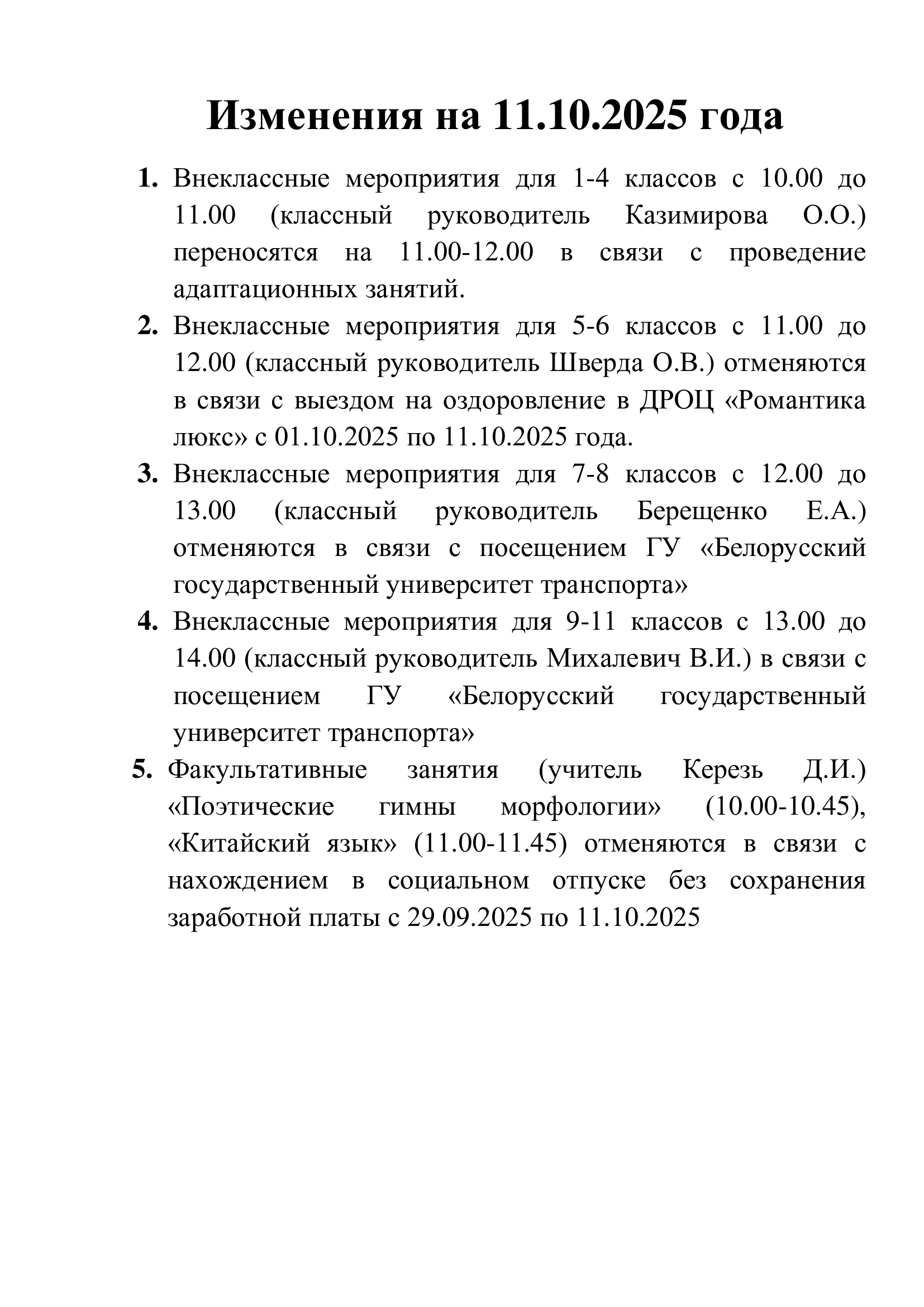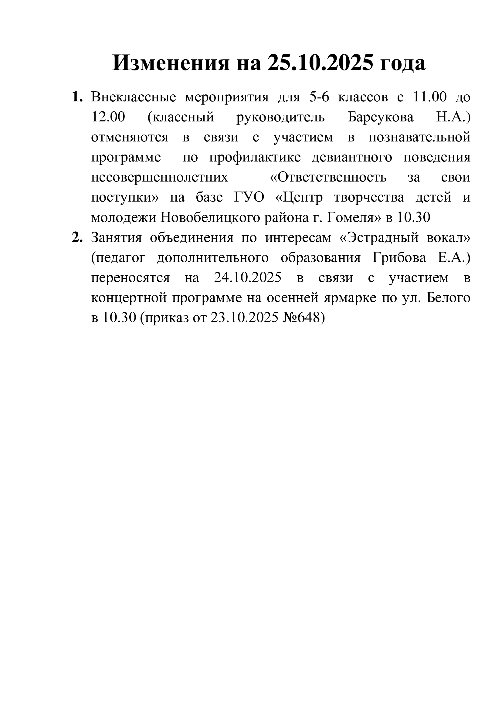 Изменения в план работы в 6-ой школьный день 25.10.2025
