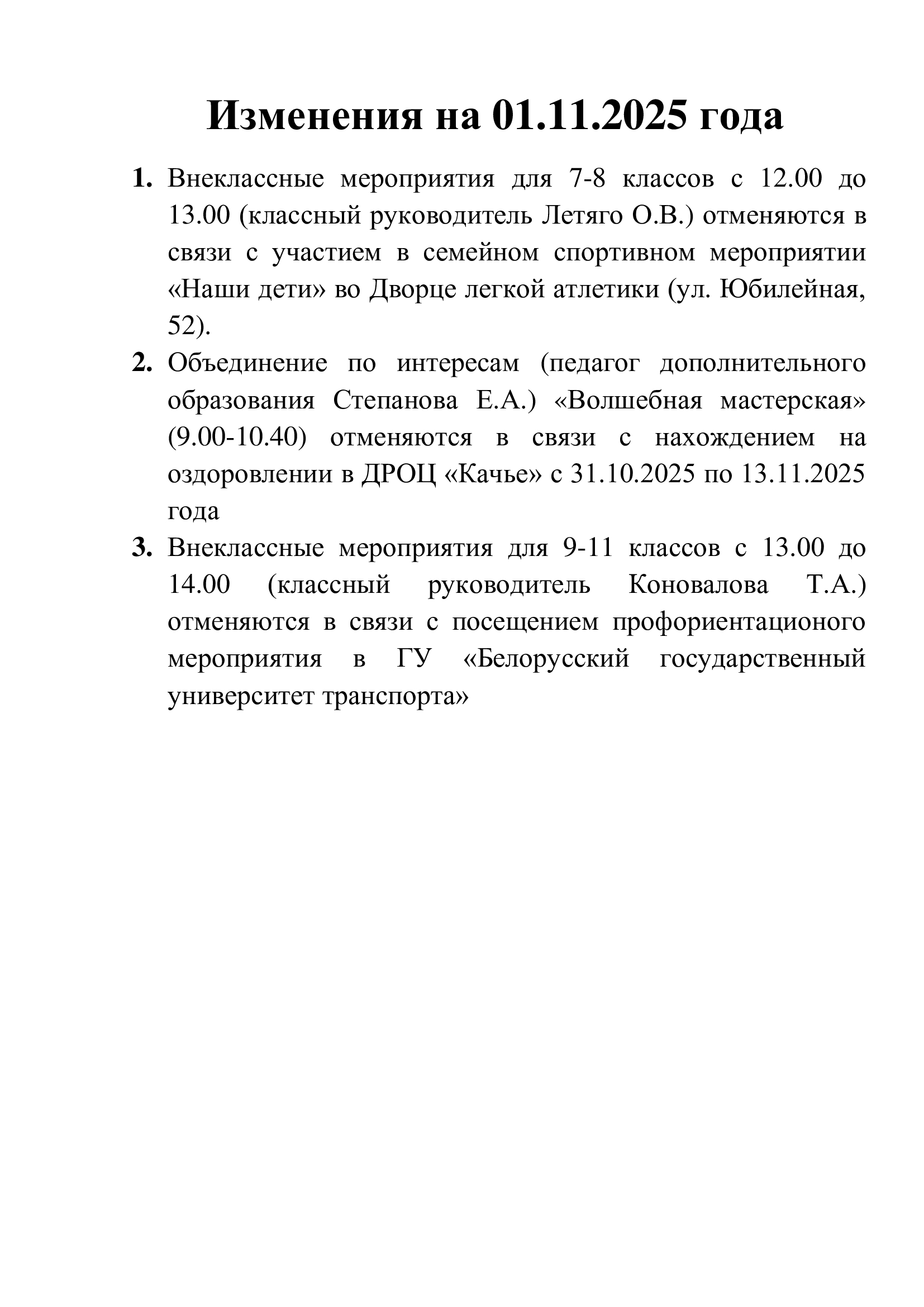 Изменения в план работы в 6-ой школьный день 01.11.2025