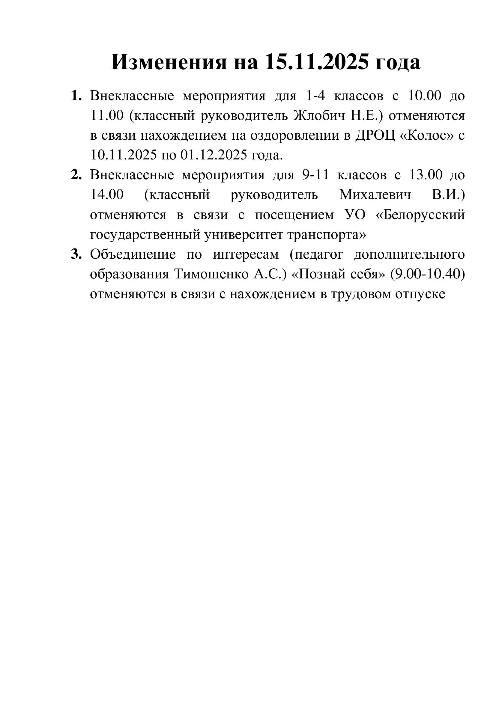 Изменения в план работы в 6-ой школьный день 15.11.2025